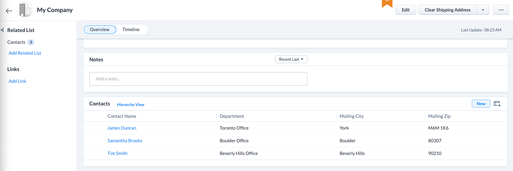 In this example, let's say that you have an account for your company called "My Company" and all the contacts are the office locations for your company, with each contact name representing the sales person and the department representing the branch name.